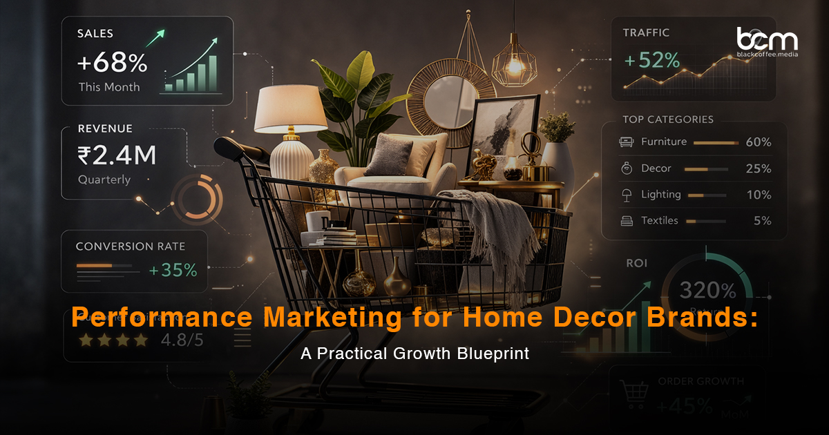 BlackCoffee Media (BCM) specializes in performance marketing for home decor brands that are ready to scale profitably. We’ve managed ₹500Cr+ in ad spend across 100+ brands, and our frameworks are built on category-specific insights – long purchase cycles, high AOV dynamics, visual storytelling requirements, and multi-touch attribution complexity.